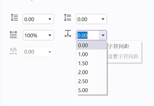 如果要调整行间距或者字间距,我们可以点击该功能后面的小三角形,来选择数字,数字越大间距越大。小三角形后面最大的数字为5,但是我们可以手动输入任意数字哦!