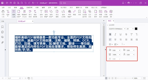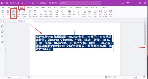 我们利用福昕高级PDF编辑器打开一份文档,点击“编辑”>“编辑文本”,然后选择要调整的文字,点击右侧小三角形打开格式面板。